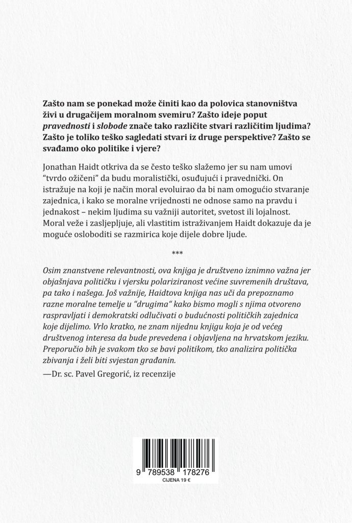 Uglavnom, Haidt završava pozitivno, što je očekivano, mada nije skroz uvjerljivo. Ima nade. Kao prvo, trebalo bi osvijestiti činjenicu da nas moral veže uz našu zajednicu, ali nas i zasljepljuje za ono što vide članovi druge, moralno drukčije, zajednice. Ljudi s kojima se moralno ne slažemo nisu nužno zli ili glupi, nego vide drukčiji moralni svijet. Možemo civiliziranije živjeti ako prihvatimo vlastita ograničenja i svoje moralne pristranosti. Nećemo se svi nikad složiti. To možemo zaboraviti, ali se zato možemo bolje razumjeti, manje demonizirati i konstruktivnije se ne slagati.