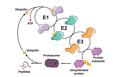 Ovaj pristup koristi puteve degradacije proteina koji su već prisutni u stanici, prvenstveno ubikvitin-proteasomski sustav, kako bi se ciljani protein označio za uništenje, čime se on trajno uklanja iz stanice. Ubikvitin-proteasomski sustav djeluje kao unutarnji „odred za čišćenje“ stanice. Proteini koji su stari, oštećeni ili pogrešne trodimenzionalne strukture, označavaju se molekulom ubikvitina, malim proteinom od 76 aminokiselina, koji se kovalentno veže na protein pomoću niza enzima. Aktivacija ubikvitina započinje enzimom E1, slijedi njegov transport i prijenos preko E2 konjugacijskog enzima, dok E3 ligaza prepoznaje specifične ciljne proteine i katalizira dodavanje ubikvitinskog lanca. Kada protein nosi dovoljno ubikvitinskih oznaka, prepoznaje ga proteasom, velika proteolitička struktura unutar stanice koja cijepa protein u peptide i tako ga uništava (slika 1). Ubiquitin-proteasomski sustav iznimno je složen, vremenski strogo reguliran i evolucijski očuvan stanični put koji ima ključnu ulogu u velikom broju staničnih funkcija. Od stanične diferencijacije do stanične smrti, u velikoj mjeri određuje sudbinu stanica i proteina. Razumijevanje ovog sustava iznimno je važno jer poremećaji u ovom putu često upućuju na patogenezu mnogih bolesti.