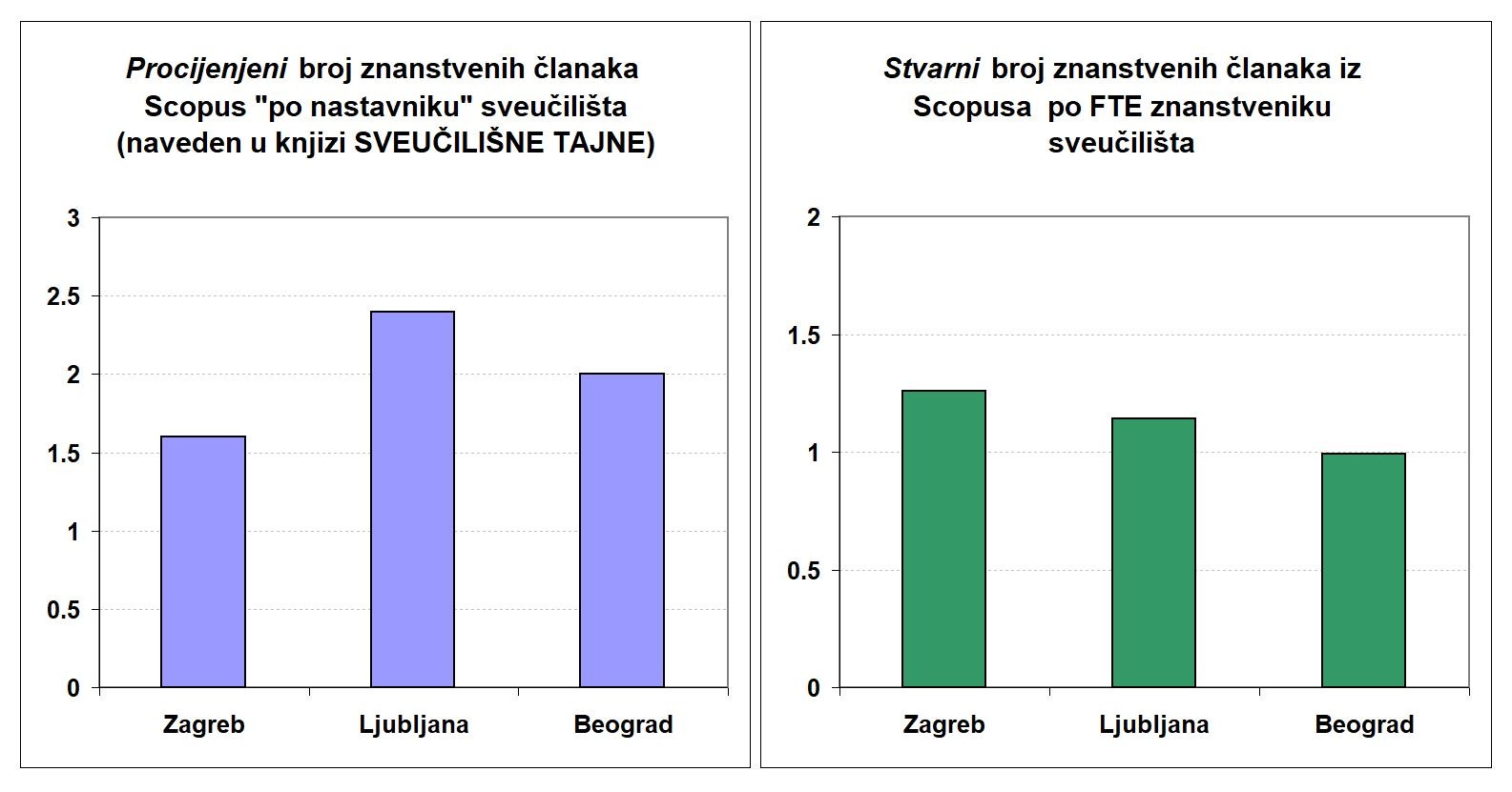 [vi] Pojmovi „stvarnog“ ili „točnog“ kod ovakvih izračuna prilično su problematični. Ono što možemo je probati racionalno doći do nekih logičnih obuhvata podataka, stvarnih vrijednosti, kao i najsmislenijeg mogućeg načina njihovog križanja u nekakve proračune outputa. I u ovom mojem proračunu, koji je znatno smisleniji od onog u knjizi, naprosto zato što se temelji na stvarnijim brojevima onog što je odabrano za usporedbu, postoje faktori koji nisu uračunati, odnosno obuhvat podataka koje je arbitrarno određen s moje strane. Na strani inputa, ovdje su uračunati samo osnovni zaposlenici sveučilišta (s uračunatim zaposlenicima na projektima). Ono što je ostalo izvan toga jesu dio doktorskih studenata i dio vanjskih suradnika. To su dvije kategorije ljudi koje u nekoj mjeri doprinose znanstvenom outputu sveučilišta, ali je njihov broj i doprinos znanosti praktički nemoguće procijeniti bez da se ide analizirati baš svaki konkretan slučaj, od osobe do osobe. Ukupni brojevi doktoranada ne znače ništa, jer dio doktoranada uopće nije ni došao do znanstvenog dijela rada (neki su samo upisali doktorat i svojom vlastitom odlukom više ne rade ništa, a neki još nisu prošli ni predavanja i ispite). Možda bi se mogao uvrstiti samo broj onih koji su u konkretnoj godini doktorirali jer je za njih sigurno da su radili znanstveni rad (disertaciju). Međutim, tu postoji veliko preklapanje brojeva jer su znanstveno najaktivniji doktorandi za ovakva velika sveučilišta oni koji su već zaposleni na tom istom sveučilištu (asistenti), pa su već prethodno uračunati u broj znanstvenika sveučilišta i ne treba ih brojati dvaput. S vanjskim suradnicima je problem što je većina (bar kod nas) samo nastavno usmjerena, a za ovakva velika sveučilišta dobar dio njih su zapravo „unutrašnji-vanjski“ suradnici – broje se nekom fakultetu kao „vanjski“, iako su zaposleni na nekom drugom fakultetu istog sveučilišta. Pukim zbrajanjem svih brojeva na sveučilištu s ukupno 7 tisuća zaposlenih došli bismo na taj način do preko 10 tisuća fiktivnih „različitih ljudi“, što nema smisla i ne daje točan broj. Vanjski suradnici možda više utječu na mala sveučilišta u tablici, popravljaju im rezultat, ali ona nisu predmet ovog razmatranja triju najvećih sveučilišta svake države. Na strani outputa u ovom slučaju kod ukupnog broja članaka Sveučilišta nisam uračunavao one članke iz Scopusa koji imaju afilijaciju samo sa (zdravstvenih) klinika. To su članci koje de facto pišu profesori medicinskih fakulteta sveučilišta, ali administrativnom namjerom ili pogreškom na radu nisu naveli da su ujedno i zaposlenici sveučilišta. Nisam to naveo jer je moguće da su na klinikama zaposleni profesori s više medicinskih fakulteta odnosno sveučilišta, pa je bez točkastog prebrojavanja od osobe do osobe nemoguće to razvrstati. Međutim, pogled na Scopus ukazuje da je problem možda i najizraženiji (bio) upravo u Zagrebu i da bi uvrštavanjem baš svih članaka svih klinika za promatrana tri sveučilišta rezultat zagrebačkog bio još bolji od zeleno prikazanog na slici.