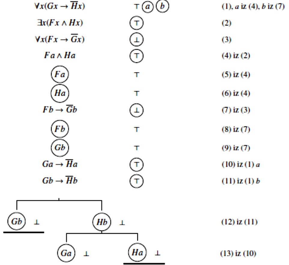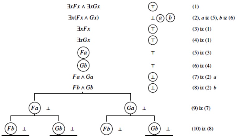 Zahtjev Fa∧Ga⊥ može se ostvariti na dva načina, tako da Fa bude ⊥ ili da Ga bude ⊥. Te dvije alternative postaju dvije grane našeg semantičkog stabla. Zahtjev Fb∧Gb⊥ također se ostvaruje na dva alternativna načina, Fb⊥ ili Gb⊥, što otvara po dvije nove grane na svakoj od prethodne dvije: