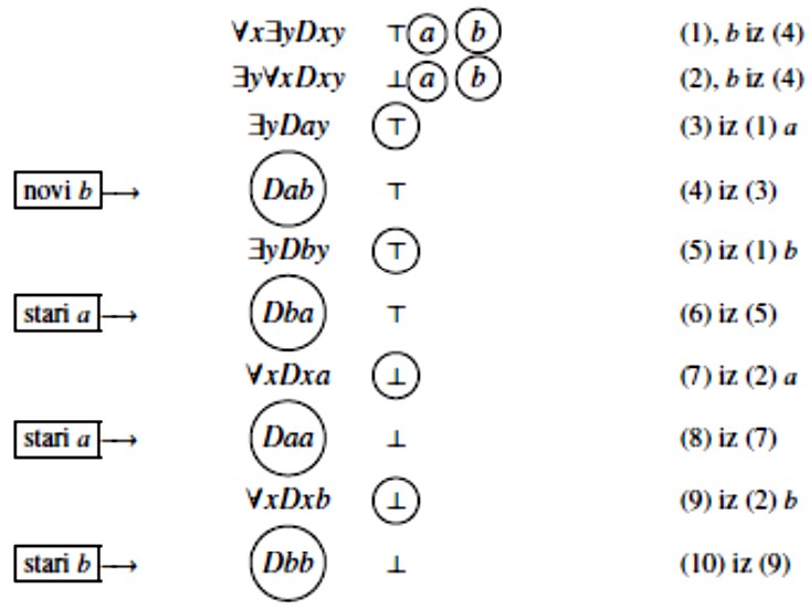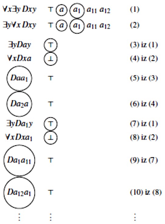 Stablo se zatvorilo. Znači li to da ∀x∃yDxy ⊨ ∃y∀xDxy? Ne, ono se zatvorilo jer nismo uvodili nove objekte u (5) i (6). Time smo univerzum sveli na samo jedan objekt a, pa je ono što možemo zaključiti samo to da “implikacija” vrijedi u strukturama s jednočlanim univerzumom. Naravno, to nije implikacija.