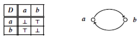 Strelica između o i o1 znači da je Doo1 ⊤, a crtice između o i o2 znače da je Doo2 ⊥.