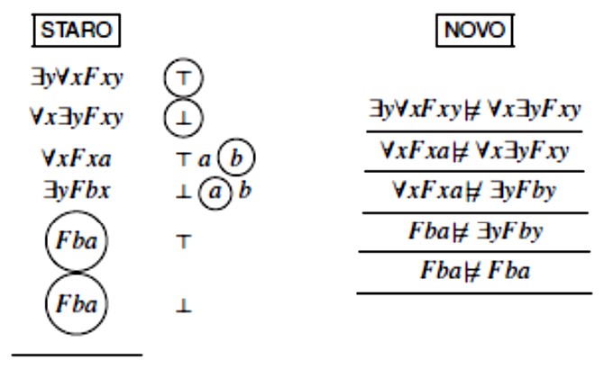 Da do kraja analiziramo zahtjev ∀xF ⊤ moramo F „potvrditi“ o svakom objektu a∈U. Svaka parcijalna potvrda objektom a naznačena je zaokruženim a.