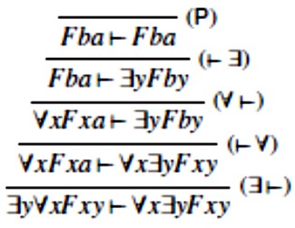 U obje notacije semantičko stablo se zatvorilo, što znači da ∃y∀xFxy ⊨∀x∃yFxy. Obrnemo li stablo u novoj notaciji i zamijenimo li svaki⊭ s ⊨ , dolazimo do dokaza od ∃y∀xFxy ⊨ ∀x∃yFxy u Gentzenovom sekventnom Q–sustavu: