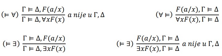 Da vrijede (∀⊨) i (⊨∃) slijedi iz ∀ x F(x) ⊨ F(a/x) i F(a/x) ⊨ ∃xF(x). Dokaz pravila (⊨ ∀) i (⊨ ∃) malo je složeniji. Pretpostavimo da Γ ⊭ Δ,∀xF(x), te da se a ne pojavljuje u Γ i Δ. Onda postoji struktura \(\small \mathcal{U}\) u kojoj su sve forme iz Γ istinite, sve iz Δ neistinite i u kojoj je ∀xF(x) neistina. Iz \(\small \mathcal{U}\) ⊭ ∀xF(x) slijedi da u univerzumu U postoji m takav da \(\small \mathcal{U}^{a}_{m}\) ⊭ F(a/x). No to znači da \(\small \mathcal{U}^{a}_{m}\) dokazuje Γ ⊭ Δ, F(a/x). Dakle, iz Γ ⊭ Δ, ∀xF(x) slijedi Γ ⊭ Δ, F(a/x). To znači da iz Γ ⊨ Δ, F(x), slijedi Γ ⊨ Δ, ∀xF(x). Time smo dokazali (∀⊨). Na isti se način dokazuje (⊨∃).