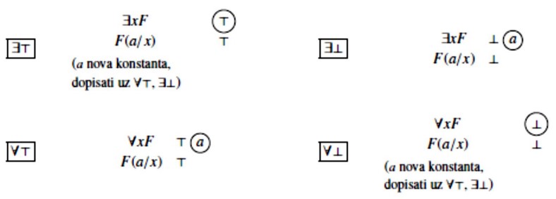 \(\small \mathcal{U} \models \exists x F\) akko \(\small \exists m \in U(\mathcal{U}^a_m \models F(a/x))\), gdje je a individualna konstanta koja se ne pojavljuje u F.