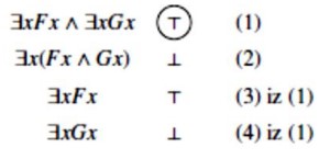 Da ∃xFx ∧ ∃xGx ⊭ ∃x(Fx ∧ Gx) dokazujemo tako da izgradimo strukturu koja formu ∃xFx ∧ ∃xGx vrednuje s ⊤, a formu ∃x(Fx ∧ Gx) vrednuje s ⊥: