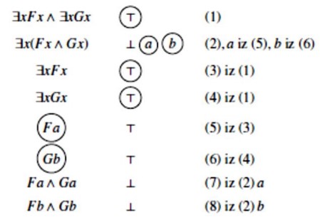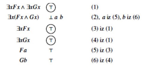 Zahtjevi ∃xFx⊤ i ∃xGx⊤ ostvaruju se tako da u univerzum uvedemo objekte a i b takve da Fa i Gb budu ⊤.