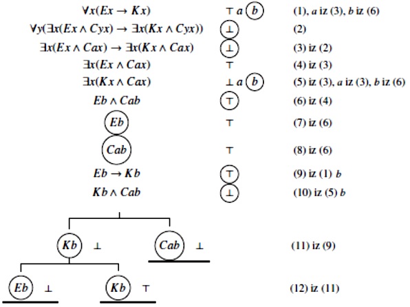 Kada ispunjavamo zahtjeve oblika ∀xA(x)⊤ i ∃xA(x)⊥ moramo brinuti o svemu što je u univerzumu. Naime, ti će zahtjevi biti ispunjeni tek kada se ispune zahtjevi A(a)⊤, A(b)⊤,…; odnosno A(a)⊥, A(b)⊥,…; za sve objekte a,b,… koji su u univerzumu. Zato uz zahtjeve oblika ∀xA(x)⊤ i ∃xA(x)⊥ ispisujemo sve objekte uvedene u univerzum (vidi red (2) u stablu). Ti zahtjevi se ispunjavaju o svakom pojedinom objektu, što označavamo zaokruživanjem svakog pojedinog objekta: