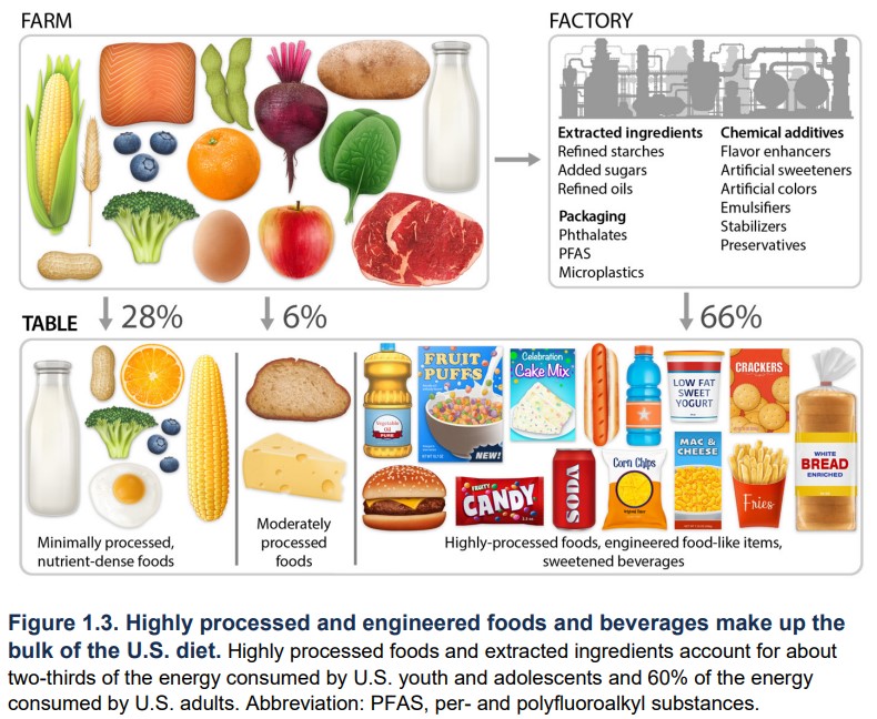 Znanstveni temelj 2025.–2030. uvodi stupanj obrade hrane kao potencijalno ključni mehanizam u određivanju što je to dobra a što loša prehrana. Ultraprocesirana hrana, iako definicija još nije izbrušena, uključuje rafinirane žitarice, dodane šećere, rafinirana ulja i masti te dug popis aditiva (zaslađivači, pojačivači okusa, boje, emulgatori), i sve se to smatra lošim prehrambenim izborom. Ukratko, treba izbjegavati visoko procesiranu hranu (“highly processed packaged, prepared, ready-to-eat“) uz preporuku da se prioritet daje pripremi hrane kod kuće od osnovnih sastojaka.