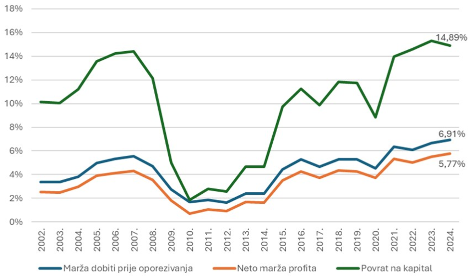 Na Idejama se već pisalo o rekordnim profitnim maržama koje ostvaruju domaća poduzeća u privatnom vlasništvu. Godine 2024. su domaća poduzeća u privatnom vlasništvu ostvarila povijesno najveće profitne marže. Drugim riječima, postotak prihoda poduzeća koji poduzeća u konačnici (kada podmire rashode) ostvaruju u obliku dobiti (profitna marža) nikada nije bio veći. Od 2019. do 2024. godine se dobit prije oporezivanja po radniku u prosjeku povećala 82,4 %, dok je rast plaće po radniku iznosio osjetno skromnijih 51,5%.
