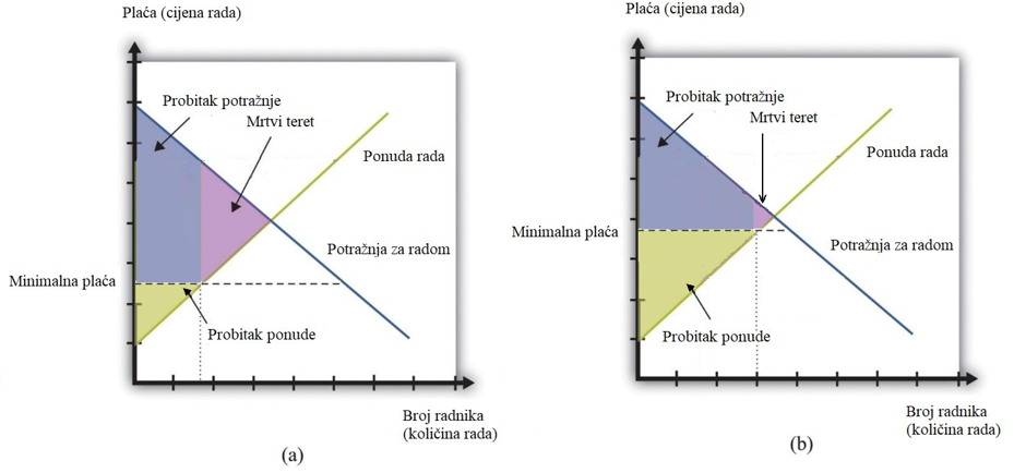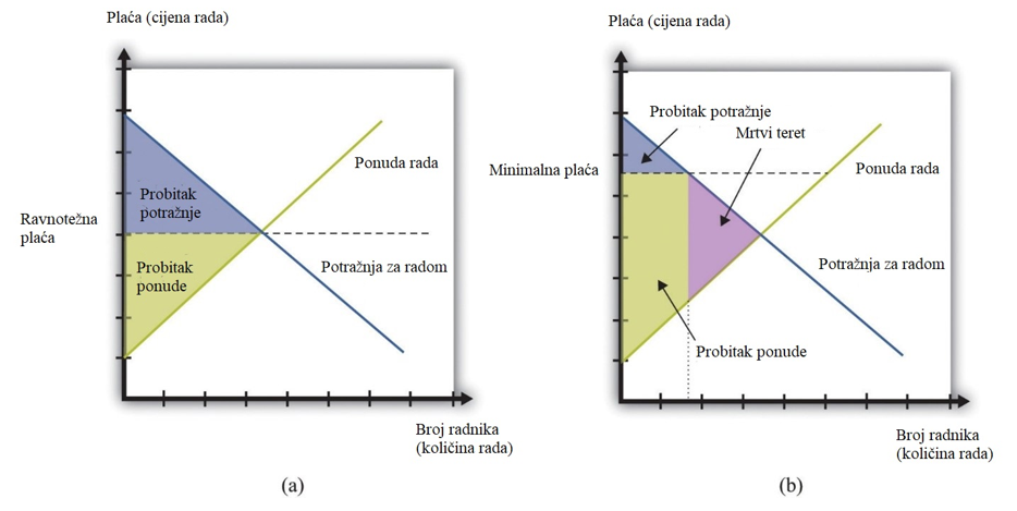 Ovdje tržište funkcionira kako je namijenjeno, pronalazi ravnotežnu cijenu rada na sjecištu ponude i potražnje, gdje je ukupni društveni probitak (probitak potražnje/plavi trokut + probitak ponude/žuti trokut) maksimiziran (potražnja na tržištu rada je poslodavac, a ponuda radnik). Kada država prisilno poveća minimalnu plaću iznad ravnotežne (dijagram 1b), rezultat je manjak potražnje u odnosu na ponudu (nezaposlenost), povećava se probitak ponude (radnika koji još imaju posao) nauštrb potražnje (poslodavca). Međutim, dio radnika koji je prije mogao naći posao sada ne može. Rezultat je da, unatoč tome što je sada probitak ponude (vjerojatno[3]) veći nego prije, ukupni probitak društva (ponude + potražnje) je sveukupno manji. Ekonomisti ovu pojavu zovu stvaranjem “mrtvog tereta” (engl. deadweight loss).