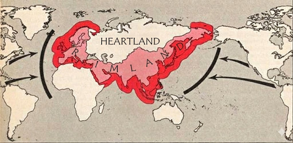 Ovaj novi obrazac jasno proizlazi iz geopolitičkih spisa autora poput Nicholasa Spykmana, a dobro ga ilustrira karta iz Spykmanove knjige The Geography of the Peace iz 1943.