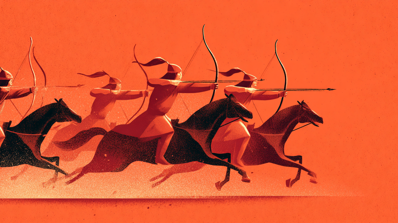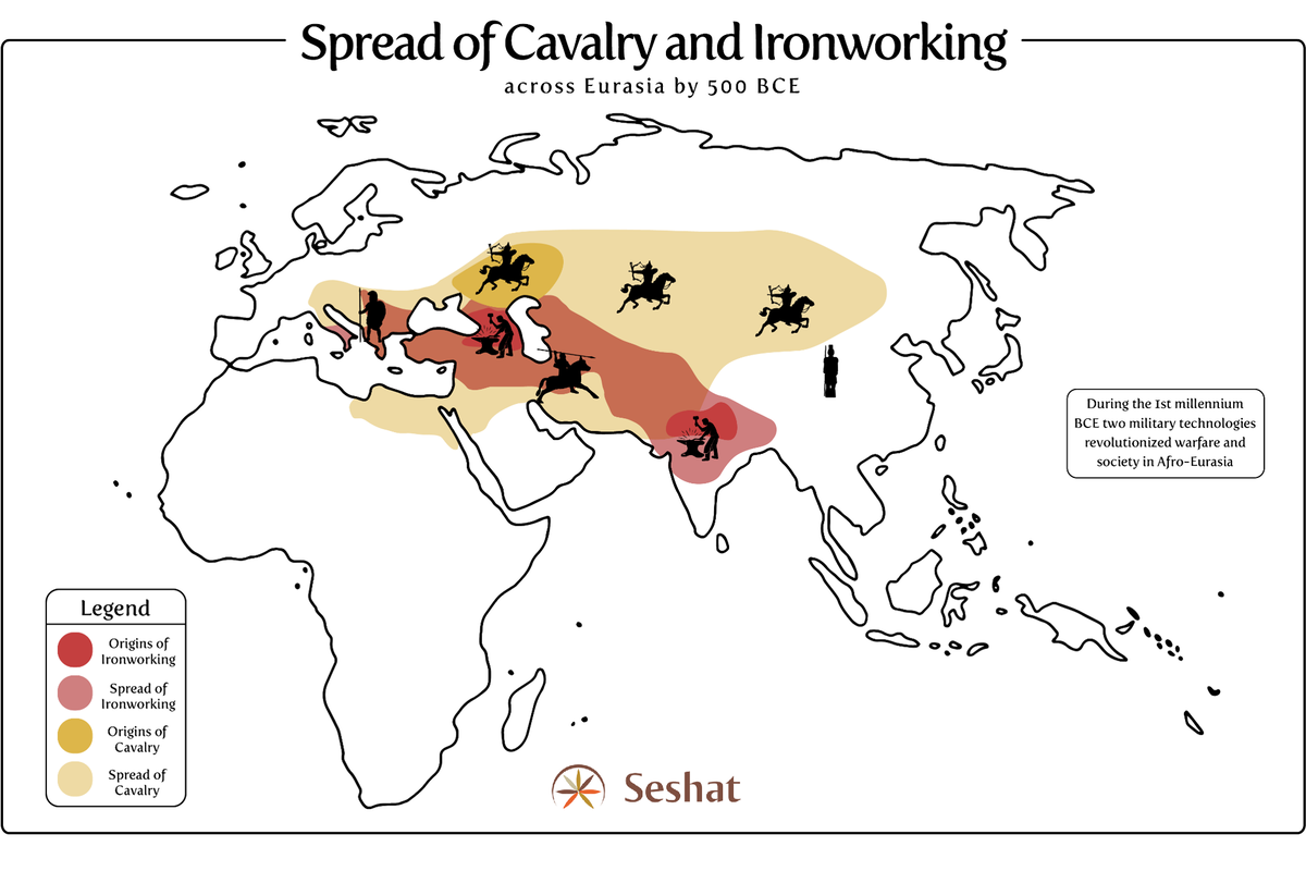 Ovaj geopolitički obrazac počeo se formirati oko tisuću godina prije Krista, kada su ljudi koji su živjeli u tom „moru trave“ shvatili kako jahati konje i koristiti lukove i strijele. Ti stvarni kentauri kombinirali su jahanje konja sa snažnim kompozitnim lukom koji je bio dovoljno kratak da se ispaljuje u galopu i čije su strijele sa željeznim šiljkom bile ubojite kao ništa prije toga. Iako su jahanje konja i taljenje željeza otkriveni neovisno i u različitim regijama, do 500. godine prije Krista širili su se zajedno (vidi donju grafiku; detaljni prikaz ove vojne revolucije i njezinih dubokih učinaka na svjetsku povijest nalazi se u Turchinovoj knjizi Ultrasociety).