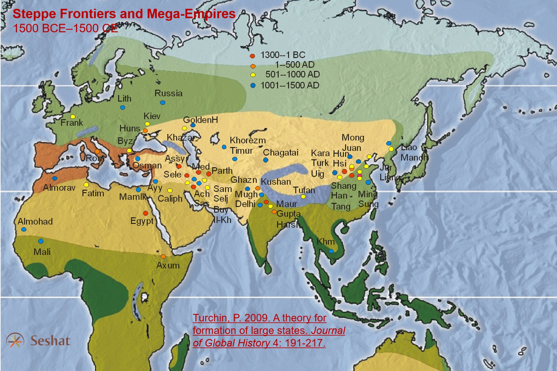 Prema jednom od najzanimljivijih Turchinovih rezultata (koji je u The Great Holocene Transformation potkrijepljen modelima, analizom velikih podataka i studijama slučaja) ključ za razumijevanje nastanka velikih carstava jest njihova prostorna konfiguracija u Euroaziji tijekom antičkog i srednjovjekovnog razdoblja. Naime, sva su ona smještena oko stepskoga srca euroazijskog kontinenta koji je bio dom nomadskih stočara. Preko 90% velikih carstava do 1500. godine nalazilo se na obalama ovog “mora trave”.