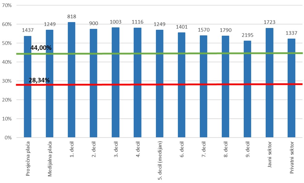 Napomene: Brojevi iznad stupaca označavaju vrijednosti za srpanj 2024. godine. Crvena linija prikazuje kumulativnu stopu inflacije, odnosno prosječni rast potrošačkih cijena. Zelena linija prikazuje kumulativnu stopu inflacije za kategoriju „Hrana“. Interpretacija decila je uobičajena – primjerice, drugi decil je u srpnju ove godine iznosio 900 eura neto, što znači da je 20% zaposlenih imalo plaću manju ili jednaku tom iznosu, a preostalih 80% plaću veću ili jednaku tom iznosu. Procjena prosječnih plaća u javnom i privatnom (poslovnom) sektoru napravljena je u skladu s metodologijom koju je koristio Nestić. Ukratko, područja NKD-a podijele se na ona u kojima je dominantan poslodavac država i ona u kojima je dominantan poslodavac privatni sektor. Procjena je nužna jer precizniji podaci nisu javno dostupni.