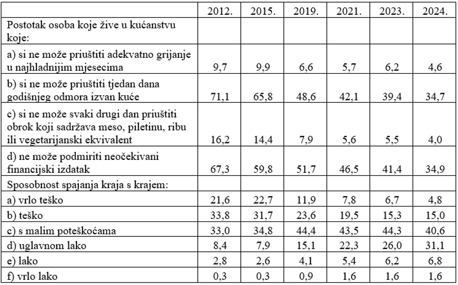 Tu su i podaci iz Ankete o dohotku stanovništva, prema kojima je 2024. godine rekordno nizak postotak ispitanika odgovorio da si ne može priuštiti adekvatno grijanje u najhladnijim mjesecima, tjedan dana godišnjeg odmora izvan kuće, podmiriti neočekivani financijski izdatak ili da vrlo teško ili teško „spaja kraj s krajem“. Ti su podaci zanimljivi jer je riječ o anketnom istraživanju. Da je stopa inflacije koju objavljuje DZS značajnije pogrešno izmjerena i da je stvarna inflacija bila veća od porasta plaća, bilo bi za očekivati da bi ova Anketa pokazivala pad životnog standarda.
