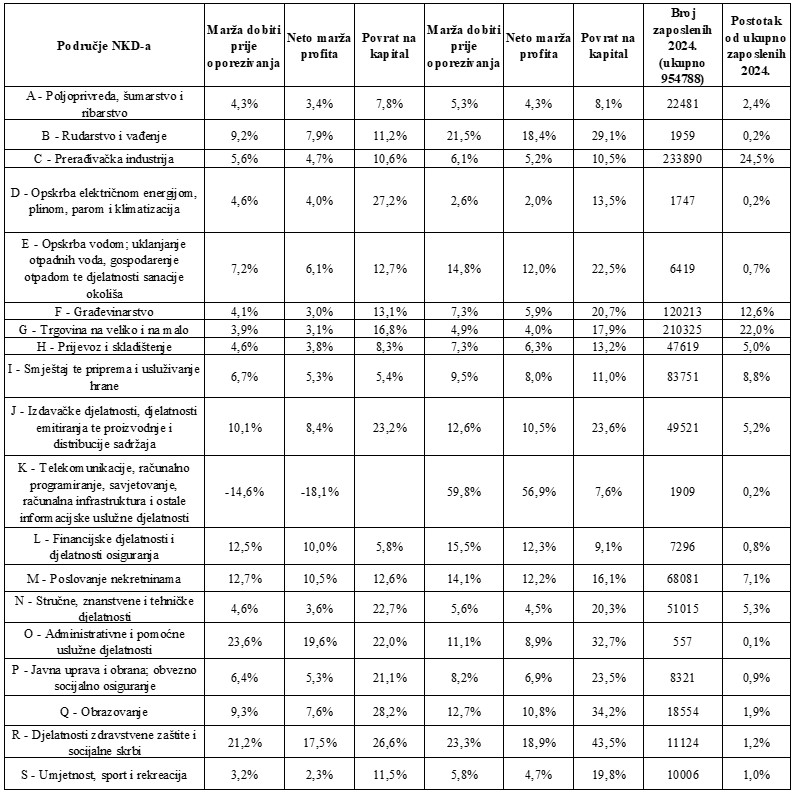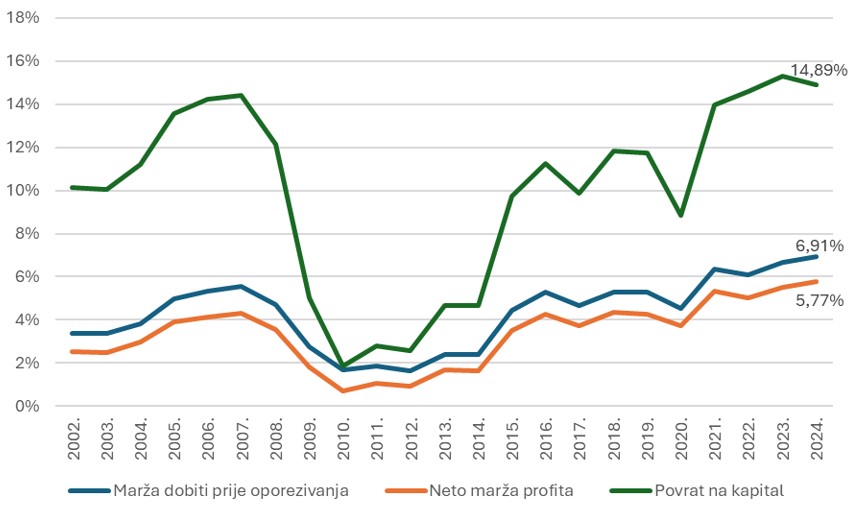 2. Iako su bruto plaće rasle po visokim stopama, što je povećalo troškove rada, iznosi dobiti rasli su osjetno više. Podaci Fine pokazuju da je profitabilnost poduzeća koja posluju u Hrvatskoj 2023. i 2024. godine bila najveća od osnutka države mjereno pokazateljima kao što su marža dobiti prije oporezivanja, neto profitna marža i povrat na kapital. Povećanje profitabilnosti vidljivo je i ako se četverogodišnje razdoblje 2021.-2024. usporedi s četverogodišnjim razdobljem 2016.-2019. Profitne marže su u 2024. godini bile više u odnosu na relativno uspješnu 2019. godinu u svim područjima NKD-a, osim u dva koja zapošljavaju zanemariv broj radnika.