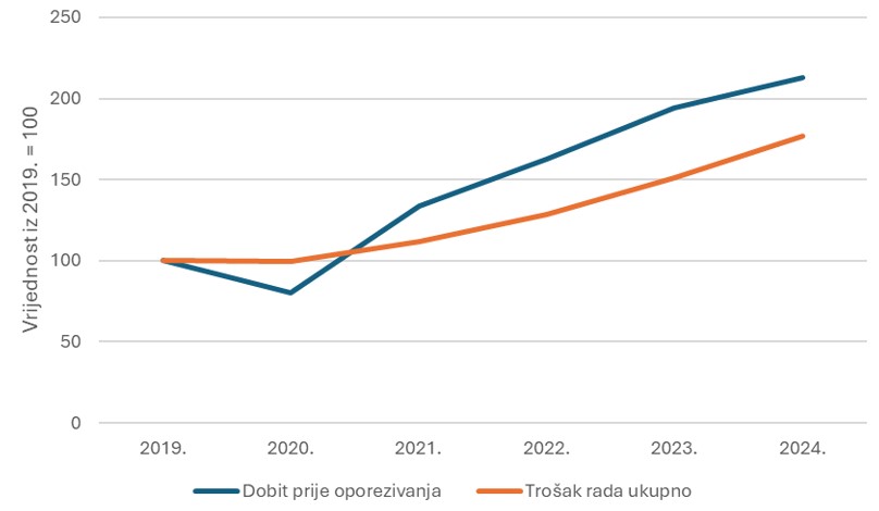 Nastavno na grafikon 3 prikazan u tekstu, ako promatramo podatke do 2024. godine nije jasno kako je moguće da radnici nisu stvorili dovoljno veliku dodanu vrijednost da pokriju isplate svojih plaća, a istovremeno jesu stvorili dovoljno veliku dodanu vrijednost da vlasnicima kapitala omoguće veliko povećanje dobiti. Da su troškovi rada bili previsoki, ne bi li profitne marže pale, a ne porasle?