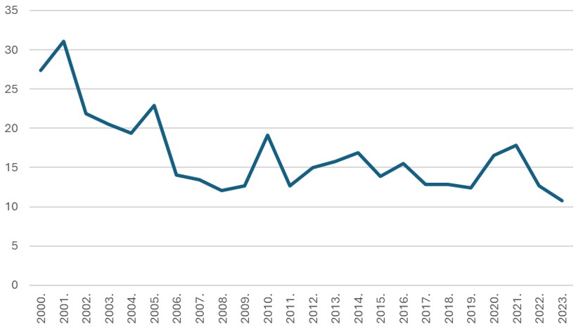 Ovaj je omjer u 2023. godini bio najniži u cijelom razdoblju za koje DZS objavljuje podatke, uz napomenu da je za 2023. godinu riječ o preliminarnim podacima. Podaci za 2024. godinu bit će objavljeni 28. listopada.