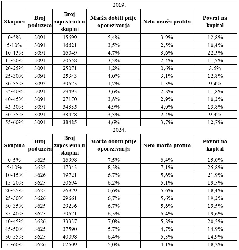 Naravno, nisu sve tvrdnje i upozorenja HUP-a netočni, ali je rasprava o troškovima rada bez spominjanja profitnih marži nepotpuna. U kontekstu odluke Vlade da se ide u daljnje povećanje minimalne plaće, zanimljivo je pogledati i kretanje profitnih marži u poduzećima koja isplaćuju najniže iznose plaća po zaposlenom. Sljedeća tablica prikazuje profitabilnost 60% poduzeća s najnižim vrijednostima troškova osoblja (troškova plaća) po zaposlenom za 2019. i 2024. godinu. Tih je 60% poduzeća podijeljeno u dvanaest skupina. Prva skupina obuhvaća 5% poduzeća s najnižim iznosima troškova osoblja po zaposlenom (0-5%), druga idućih 5% poduzeća (5-10%), treća narednih 5% poduzeća (10-15%), i tako dvanaest puta, dok se ne obuhvati svih 60%.