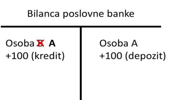 Ovo je ključna razlika: dok zajam samo premješta postojeća sredstva (od osobe A do osobe B) (2), kredit ih stvara (osoba A je u aktivi i pasivi). Banka nije posrednik između štediše i zajmoprimca, nego monetarna institucija koja proizvodi novi novac “ex nihilo”.