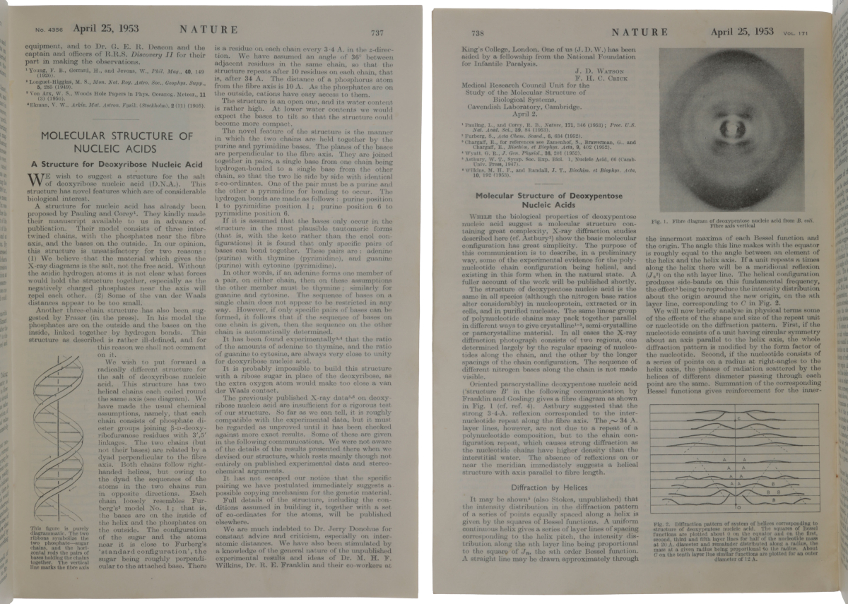 No vratimo se strukturi molekule DNA. Kada vide kao izgleda znanstveni članak u kojem su Watson i Crick prezentirali svoje otkriće, ljudi se obično iznenade. Naime, radi se samo o dvije stranice teksta, zapravo moglo bi se reći čak svega jednoj ako izuzmemo reference, u časopisu Nature (Molecular Structure of Nucleic Acids: A Structure for Deoxyribose Nucleic Acid,” Nature, April 25, 1953, vol. 171, p:737–738, https://dosequis.colorado.edu/Courses/MethodsLogic/papers/WatsonCrick1953.pdf slika 1). Nekako se valjda očekuje da tako veliko, fundamentalno otkriće mora biti opisano adekvatnom količinom teksta. Široj javnosti manje je poznato da je u istom broju Naturea izašao i rad Wilkinsa i sur. u kojem su prikazani difrakcijski podaci koji podupiru helikalnu organizaciju DNA, te rad Franklin i Goslinga koji daje detaljnu analizu difrakcijskih uzoraka koji kvantitativno potvrđuju parametre modela, te ova tri rada zapravo tvore cjelinu.